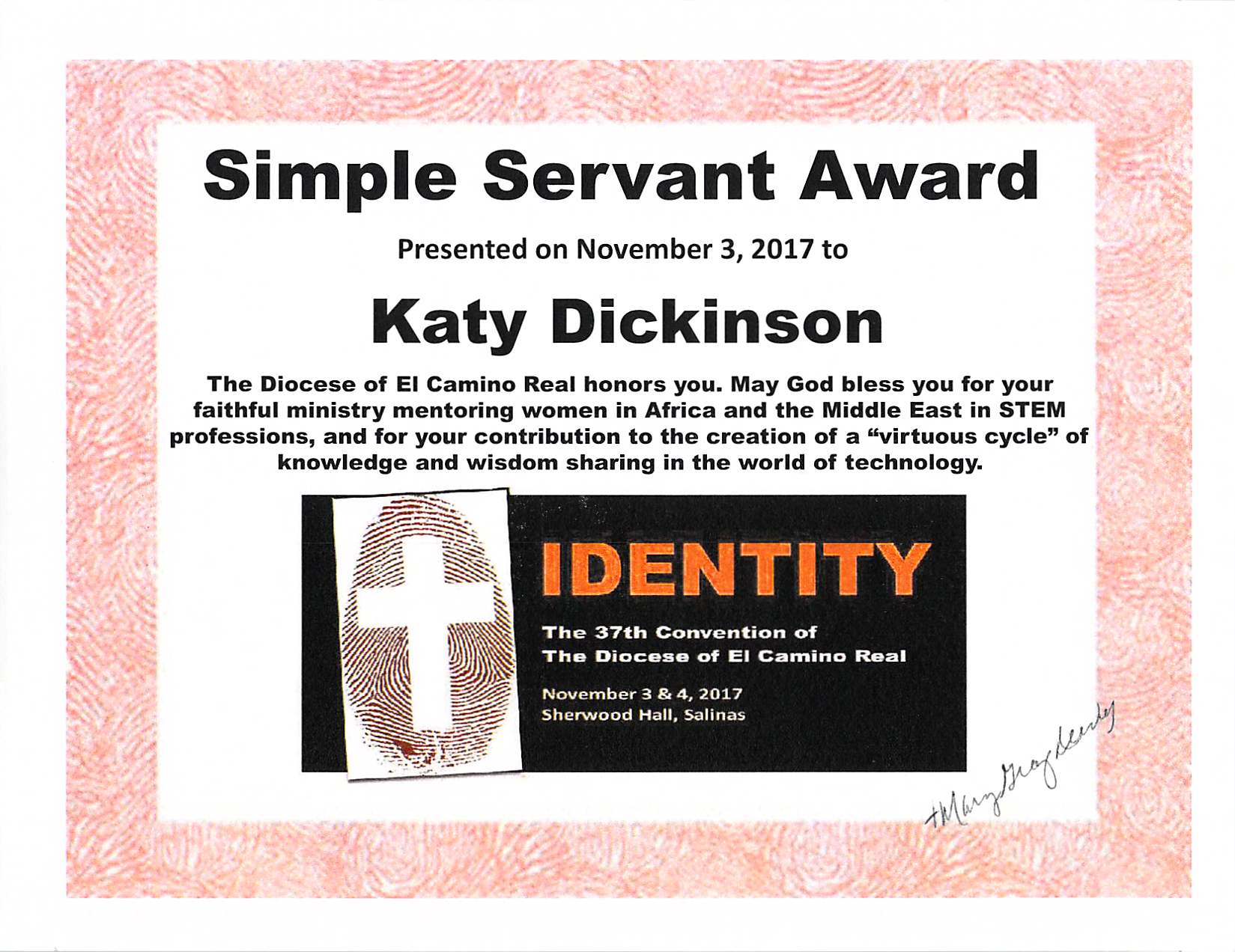 ECR Simple Servant Award to Katy Dickinson 3 Nov 2017